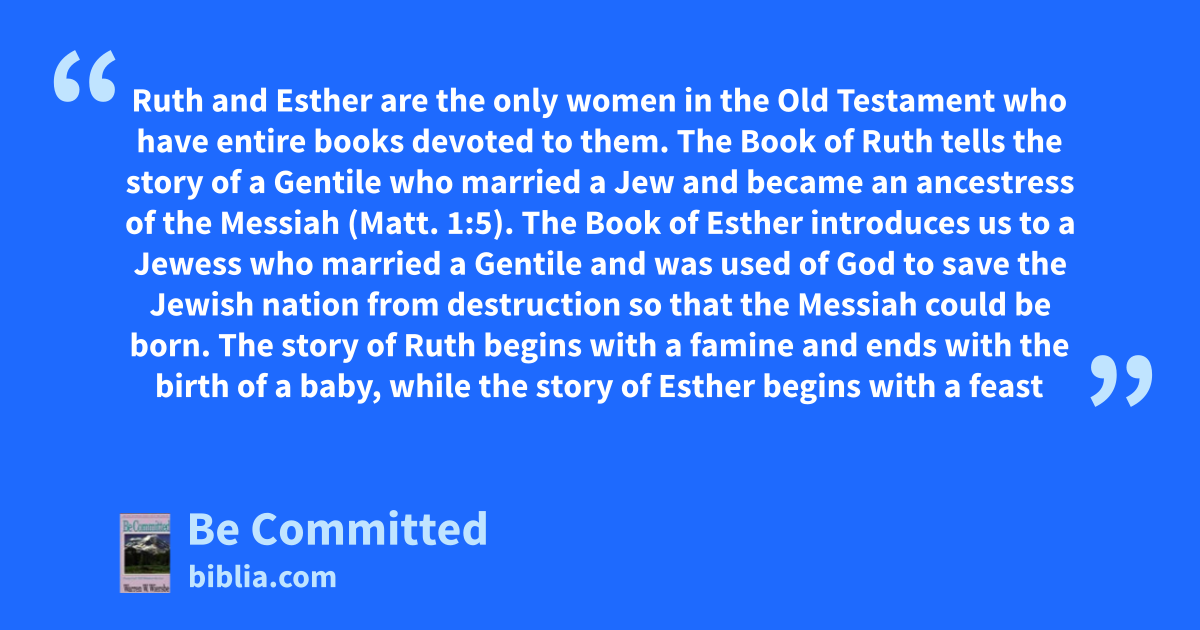 Ruth and Esther are the only women in the Old Testament who have entire books devoted to them. The Book of Ruth tells the story of a Gentile who married a Jew and became an ancestress of the Messiah (Matt. 1:5). The Book of Esther introduces us to a Jewess who married a Gentile and was used of God to save the Jewish nation from destruction so that the Messiah could be born. The story of Ruth begins with a famine and ends with the birth of a baby, while the story of Esther begins with a feast