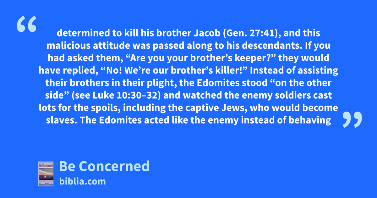 determined to kill his brother Jacob (Gen. 27:41), and this malicious attitude was passed along to his descendants. If you had asked them, “Are you your brother’s keeper?” they would have replied, “No! We’re our brother’s killer!” Instead of assisting their brothers in their plight, the Edomites stood “on the other side” (see Luke 10:30–32) and watched the enemy soldiers cast lots for the spoils, including the captive Jews, who would become slaves. The Edomites acted like the enemy instead of behaving