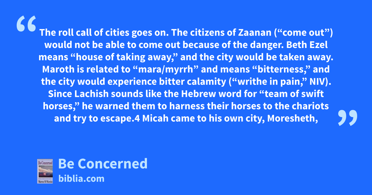 The roll call of cities goes on. The citizens of Zaanan (“come out”) would not be able to come out because of the danger. Beth Ezel means “house of taking away,” and the city would be taken away. Maroth is related to “mara/myrrh” and means “bitterness,” and the city would experience bitter calamity (“writhe in pain,” NIV). Since Lachish sounds like the Hebrew word for “team of swift horses,” he warned them to harness their horses to the chariots and try to escape.4 Micah came to his own city, Moresheth,
