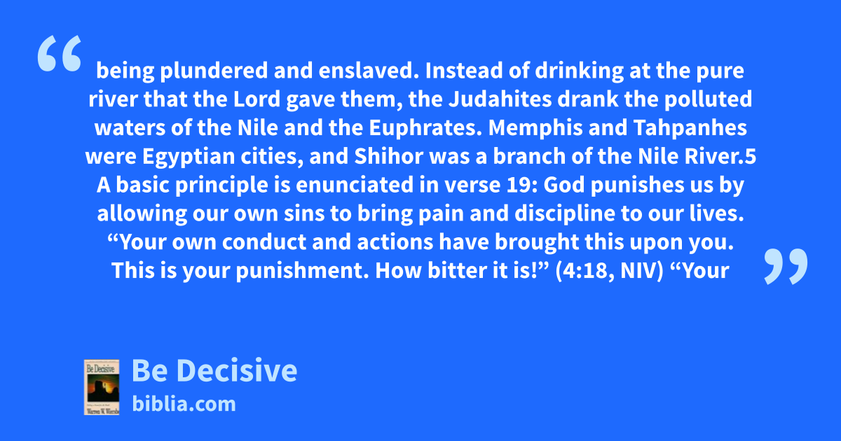 being plundered and enslaved. Instead of drinking at the pure river that the Lord gave them, the Judahites drank the polluted waters of the Nile and the Euphrates. Memphis and Tahpanhes were Egyptian cities, and Shihor was a branch of the Nile River.5 A basic principle is enunciated in verse 19: God punishes us by allowing our own sins to bring pain and discipline to our lives. “Your own conduct and actions have brought this upon you. This is your punishment. How bitter it is!” (4:18, NIV) “Your