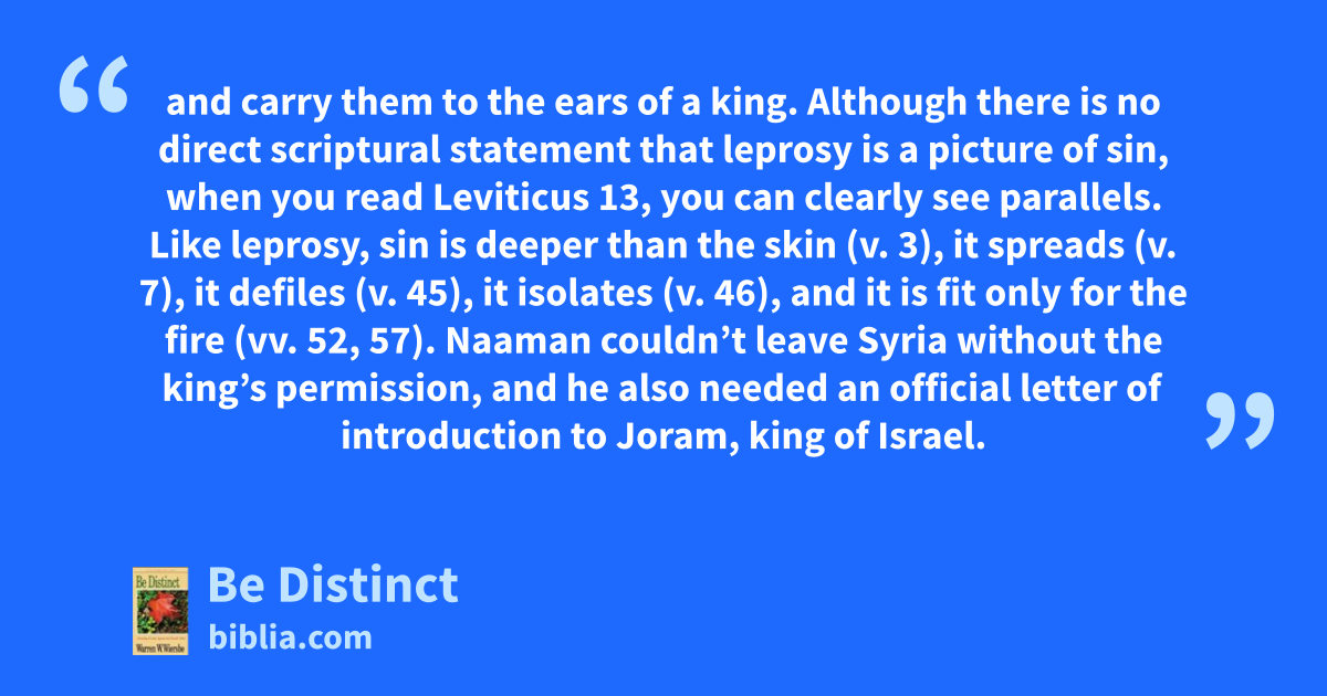 and carry them to the ears of a king. Although there is no direct scriptural statement that leprosy is a picture of sin, when you read Leviticus 13, you can clearly see parallels. Like leprosy, sin is deeper than the skin (v. 3), it spreads (v. 7), it defiles (v. 45), it isolates (v. 46), and it is fit only for the fire (vv. 52, 57). Naaman couldn’t leave Syria without the king’s permission, and he also needed an official letter of introduction to Joram, king of Israel.