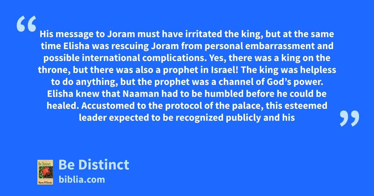 His message to Joram must have irritated the king, but at the same time Elisha was rescuing Joram from personal embarrassment and possible international complications. Yes, there was a king on the throne, but there was also a prophet in Israel! The king was helpless to do anything, but the prophet was a channel of God’s power. Elisha knew that Naaman had to be humbled before he could be healed. Accustomed to the protocol of the palace, this esteemed leader expected to be recognized publicly and his