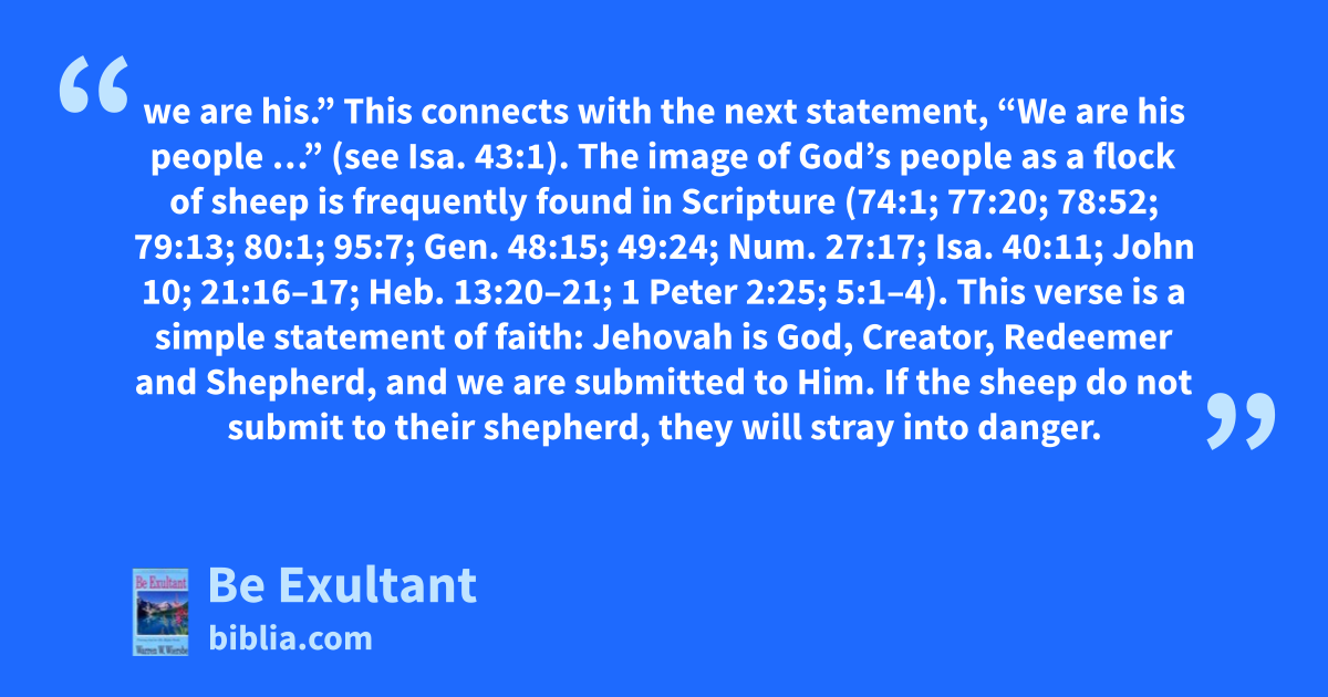 we are his.” This connects with the next statement, “We are his people …” (see Isa. 43:1). The image of God’s people as a flock of sheep is frequently found in Scripture (74:1; 77:20; 78:52; 79:13; 80:1; 95:7; Gen. 48:15; 49:24; Num. 27:17; Isa. 40:11; John 10; 21:16–17; Heb. 13:20–21; 1 Peter 2:25; 5:1–4). This verse is a simple statement of faith: Jehovah is God, Creator, Redeemer and Shepherd, and we are submitted to Him. If the sheep do not submit to their shepherd, they will stray into danger.