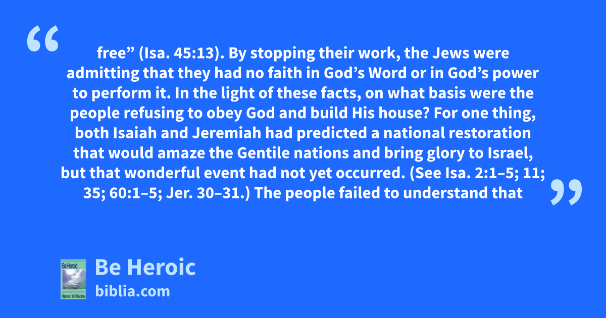 free” (Isa. 45:13). By stopping their work, the Jews were admitting that they had no faith in God’s Word or in God’s power to perform it. In the light of these facts, on what basis were the people refusing to obey God and build His house? For one thing, both Isaiah and Jeremiah had predicted a national restoration that would amaze the Gentile nations and bring glory to Israel, but that wonderful event had not yet occurred. (See Isa. 2:1–5; 11; 35; 60:1–5; Jer. 30–31.) The people failed to understand that