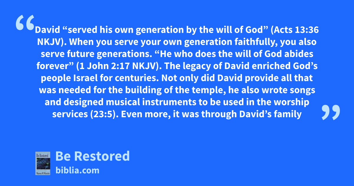 Restore to me the joy of your salvation. (Ps. 51:12a) This prayer of David’s captures the mood of 2 Kings and 1 Chronicles. Repeatedly, David learns the hard way that sin has consequences. It affects his relationship with the people of Israel, with the members of his family, and with God. But the main message of these books is not human failure, but divine faithfulness. As David experienced time...