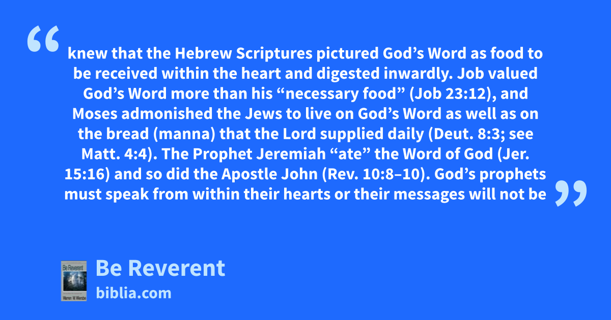 knew that the Hebrew Scriptures pictured God’s Word as food to be received within the heart and digested inwardly. Job valued God’s Word more than his “necessary food” (Job 23:12), and Moses admonished the Jews to live on God’s Word as well as on the bread (manna) that the Lord supplied daily (Deut. 8:3; see Matt. 4:4). The Prophet Jeremiah “ate” the Word of God (Jer. 15:16) and so did the Apostle John (Rev. 10:8–10). God’s prophets must speak from within their hearts or their messages will not be