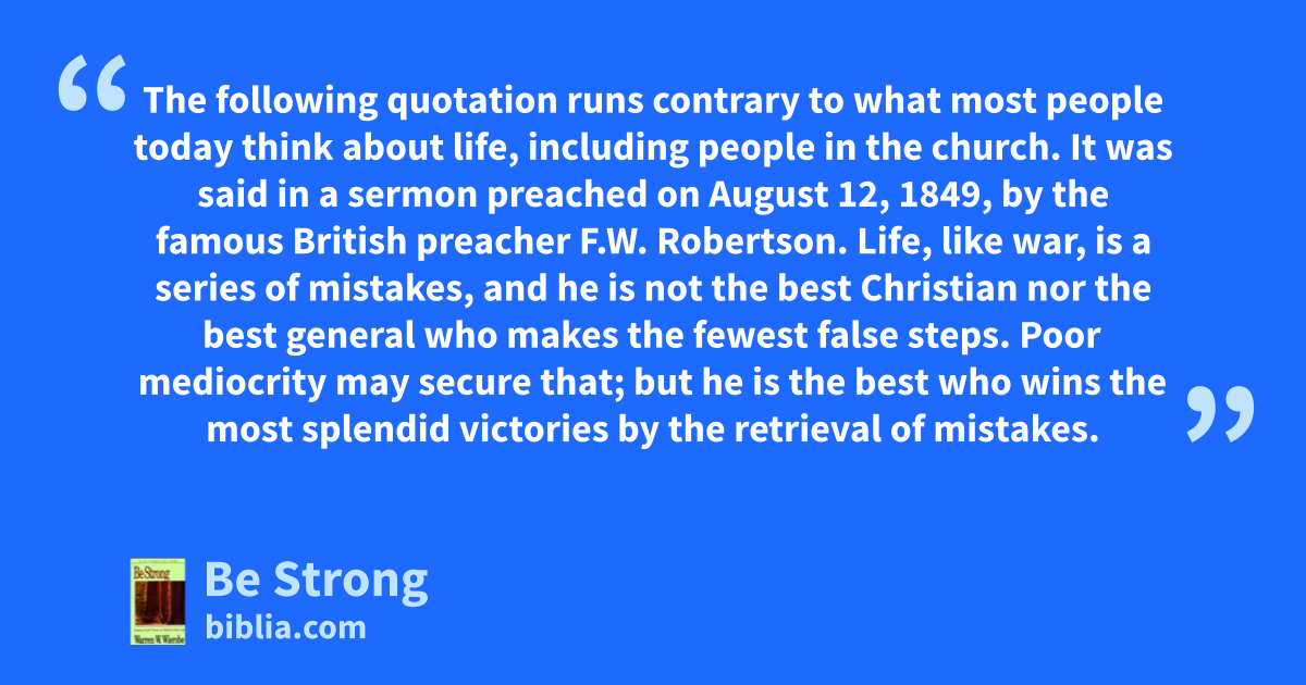The following quotation runs contrary to what most people today think about life, including people in the church. It was said in a sermon preached on August 12, 1849, by the famous British preacher F.W. Robertson. Life, like war, is a series of mistakes, and he is not the best Christian nor the best general who makes the fewest false steps. Poor mediocrity may secure that; but he is the best who wins the most splendid victories by the retrieval of mistakes.