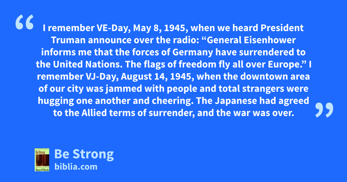 I remember VE-Day, May 8, 1945, when we heard President Truman announce over the radio: “General Eisenhower informs me that the forces of Germany have surrendered to the United Nations. The flags of freedom fly all over Europe.” I remember VJ-Day, August 14, 1945, when the downtown area of our city was jammed with people and total strangers were hugging one another and cheering. The Japanese had agreed to the Allied terms of surrender, and the war was over.