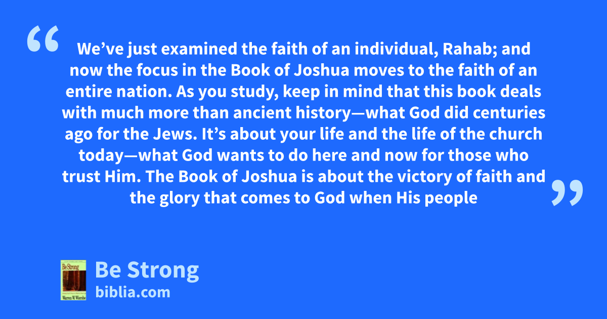 We’ve just examined the faith of an individual, Rahab; and now the focus in the Book of Joshua moves to the faith of an entire nation. As you study, keep in mind that this book deals with much more than ancient history—what God did centuries ago for the Jews. It’s about your life and the life of the church today—what God wants to do here and now for those who trust Him. The Book of Joshua is about the victory of faith and the glory that comes to God when His people