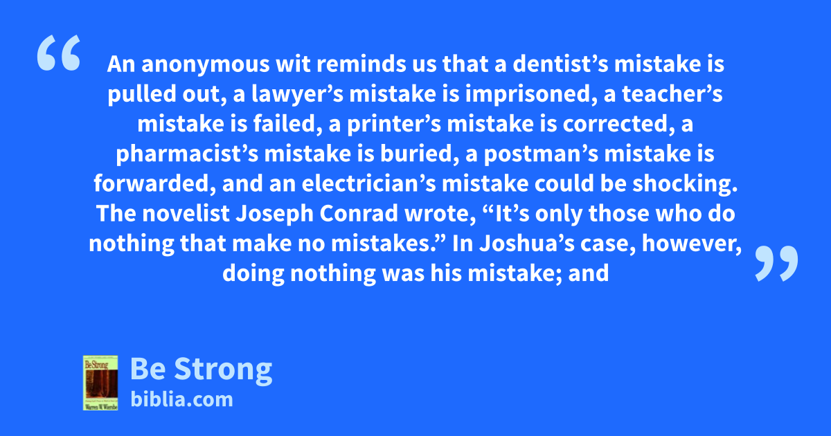 An anonymous wit reminds us that a dentist’s mistake is pulled out, a lawyer’s mistake is imprisoned, a teacher’s mistake is failed, a printer’s mistake is corrected, a pharmacist’s mistake is buried, a postman’s mistake is forwarded, and an electrician’s mistake could be shocking. The novelist Joseph Conrad wrote, “It’s only those who do nothing that make no mistakes.” In Joshua’s case, however, doing nothing was his mistake; and