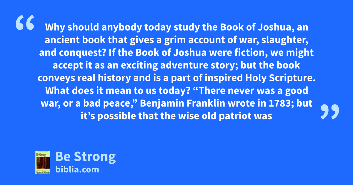 Why should anybody today study the Book of Joshua, an ancient book that gives a grim account of war, slaughter, and conquest? If the Book of Joshua were fiction, we might accept it as an exciting adventure story; but the book conveys real history and is a part of inspired Holy Scripture. What does it mean to us today? “There never was a good war, or a bad peace,” Benjamin Franklin wrote in 1783; but it’s possible that the wise old patriot was