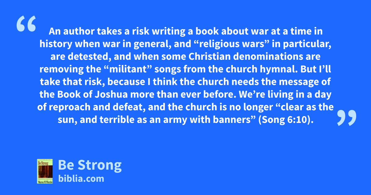 An author takes a risk writing a book about war at a time in history when war in general, and “religious wars” in particular, are detested, and when some Christian denominations are removing the “militant” songs from the church hymnal. But I’ll take that risk, because I think the church needs the message of the Book of Joshua more than ever before. We’re living in a day of reproach and defeat, and the church is no longer “clear as the sun, and terrible as an army with banners” (Song 6:10).