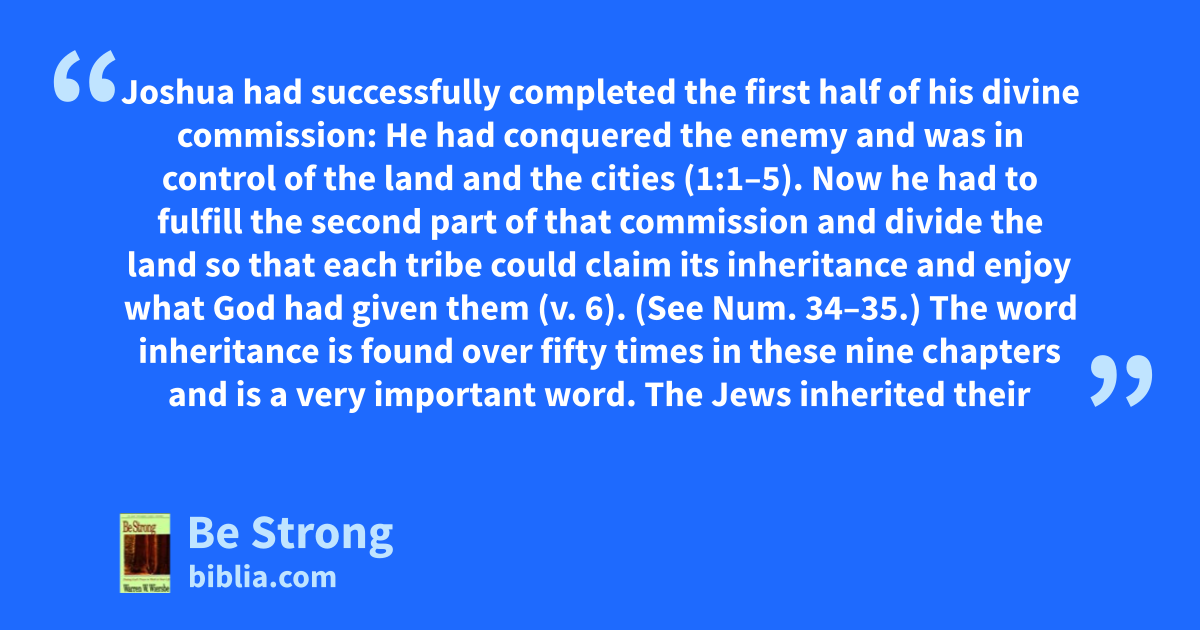 Joshua had successfully completed the first half of his divine commission: He had conquered the enemy and was in control of the land and the cities (1:1–5). Now he had to fulfill the second part of that commission and divide the land so that each tribe could claim its inheritance and enjoy what God had given them (v. 6). (See Num. 34–35.) The word inheritance is found over fifty times in these nine chapters and is a very important word. The Jews inherited their