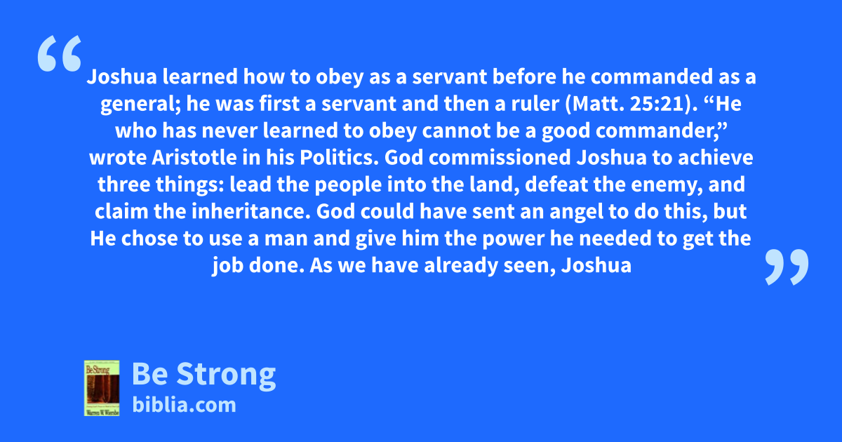 Joshua learned how to obey as a servant before he commanded as a general; he was first a servant and then a ruler (Matt. 25:21). “He who has never learned to obey cannot be a good commander,” wrote Aristotle in his Politics. God commissioned Joshua to achieve three things: lead the people into the land, defeat the enemy, and claim the inheritance. God could have sent an angel to do this, but He chose to use a man and give him the power he needed to get the job done. As we have already seen, Joshua