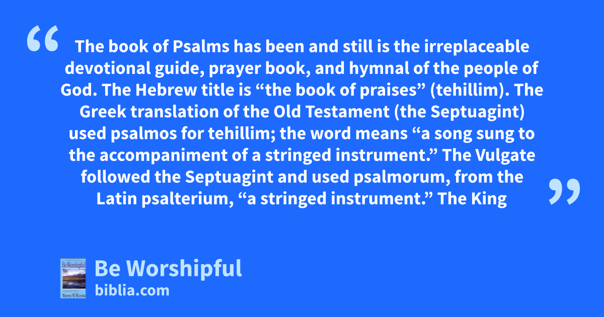 The book of Psalms has been and still is the irreplaceable devotional guide, prayer book, and hymnal of the people of God. The Hebrew title is “the book of praises” (tehillim). The Greek translation of the Old Testament (the Septuagint) used psalmos for tehillim; the word means “a song sung to the accompaniment of a stringed instrument.” The Vulgate followed the Septuagint and used psalmorum, from the Latin psalterium, “a stringed instrument.” The King