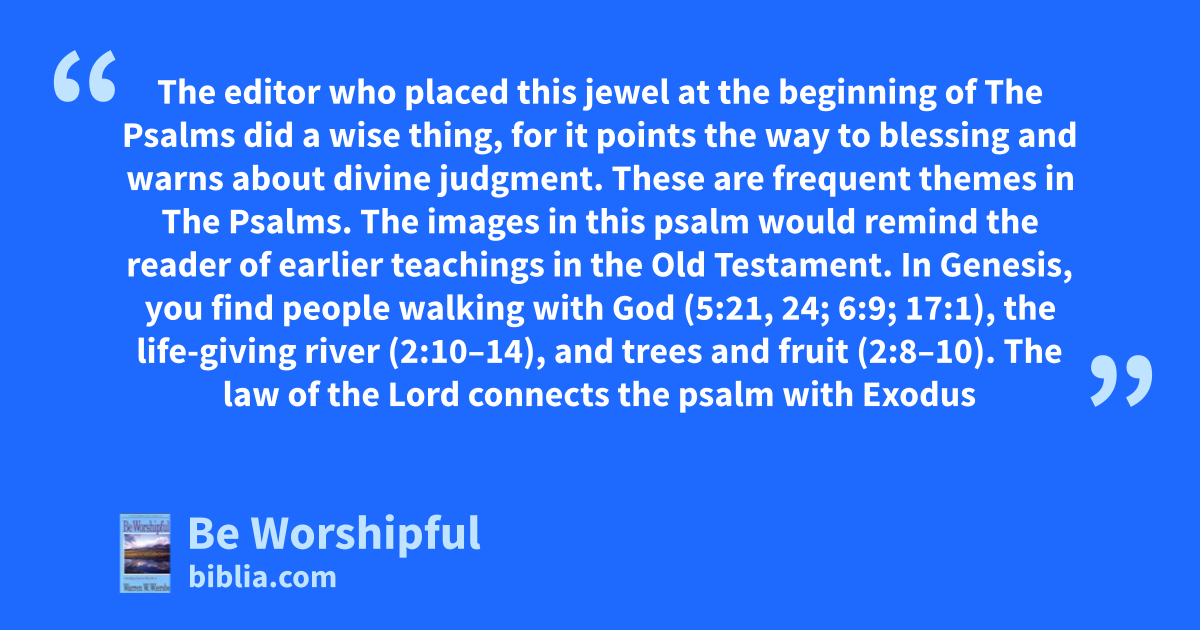 The editor who placed this jewel at the beginning of The Psalms did a wise thing, for it points the way to blessing and warns about divine judgment. These are frequent themes in The Psalms. The images in this psalm would remind the reader of earlier teachings in the Old Testament. In Genesis, you find people walking with God (5:21, 24; 6:9; 17:1), the life-giving river (2:10–14), and trees and fruit (2:8–10). The law of the Lord connects the psalm with Exodus
