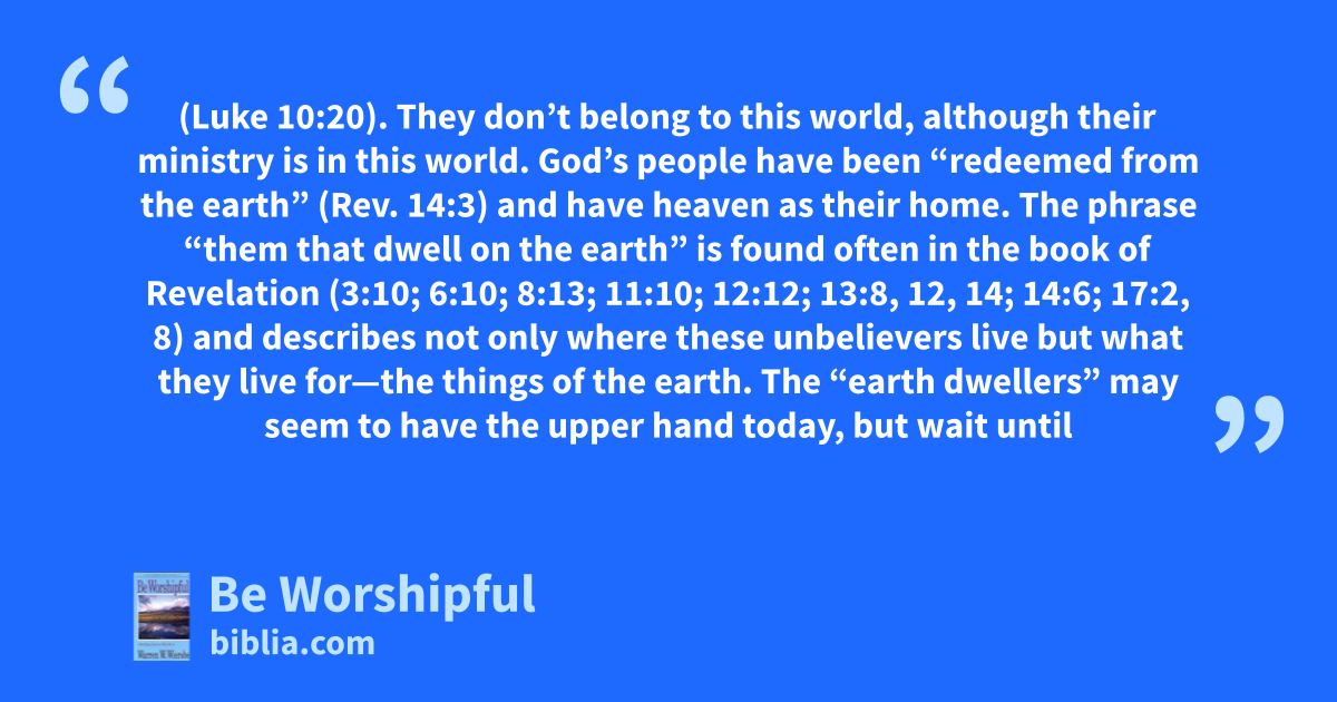 (Luke 10:20). They don’t belong to this world, although their ministry is in this world. God’s people have been “redeemed from the earth” (Rev. 14:3) and have heaven as their home. The phrase “them that dwell on the earth” is found often in the book of Revelation (3:10; 6:10; 8:13; 11:10; 12:12; 13:8, 12, 14; 14:6; 17:2, 8) and describes not only where these unbelievers live but what they live for—the things of the earth. The “earth dwellers” may seem to have the upper hand today, but wait until