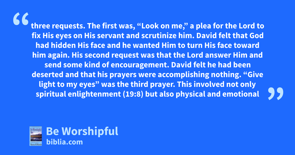 three requests. The first was, “Look on me,” a plea for the Lord to fix His eyes on His servant and scrutinize him. David felt that God had hidden His face and he wanted Him to turn His face toward him again. His second request was that the Lord answer Him and send some kind of encouragement. David felt he had been deserted and that his prayers were accomplishing nothing. “Give light to my eyes” was the third prayer. This involved not only spiritual enlightenment (19:8) but also physical and emotional