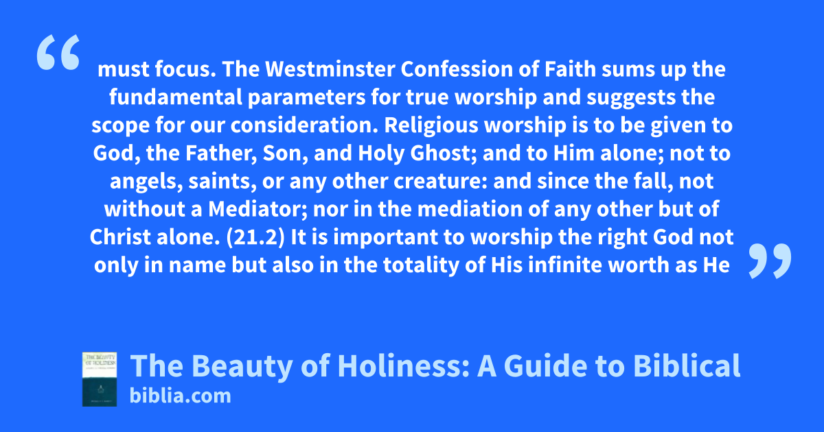 must focus. The Westminster Confession of Faith sums up the fundamental parameters for true worship and suggests the scope for our consideration. Religious worship is to be given to God, the Father, Son, and Holy Ghost; and to Him alone; not to angels, saints, or any other creature: and since the fall, not without a Mediator; nor in the mediation of any other but of Christ alone. (21.2) It is important to worship the right God not only in name but also in the totality of His infinite worth as He