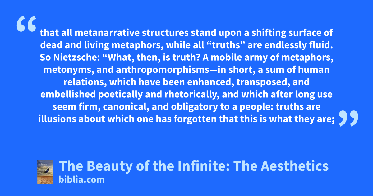 that all metanarrative structures stand upon a shifting surface of dead and living metaphors, while all “truths” are endlessly fluid. So Nietzsche: “What, then, is truth? A mobile army of metaphors, metonyms, and anthropomorphisms—in short, a sum of human relations, which have been enhanced, transposed, and embellished poetically and rhetorically, and which after long use seem firm, canonical, and obligatory to a people: truths are illusions about which one has forgotten that this is what they are;