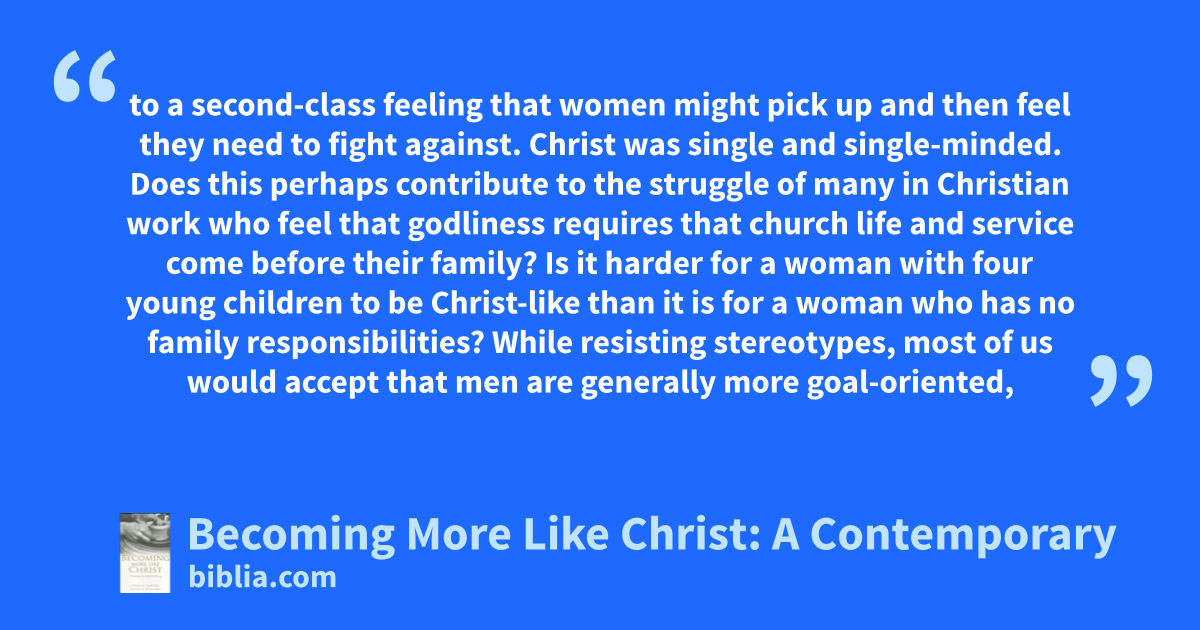 to a second-class feeling that women might pick up and then feel they need to fight against. Christ was single and single-minded. Does this perhaps contribute to the struggle of many in Christian work who feel that godliness requires that church life and service come before their family? Is it harder for a woman with four young children to be Christ-like than it is for a woman who has no family responsibilities? While resisting stereotypes, most of us would accept that men are generally more goal-oriented,