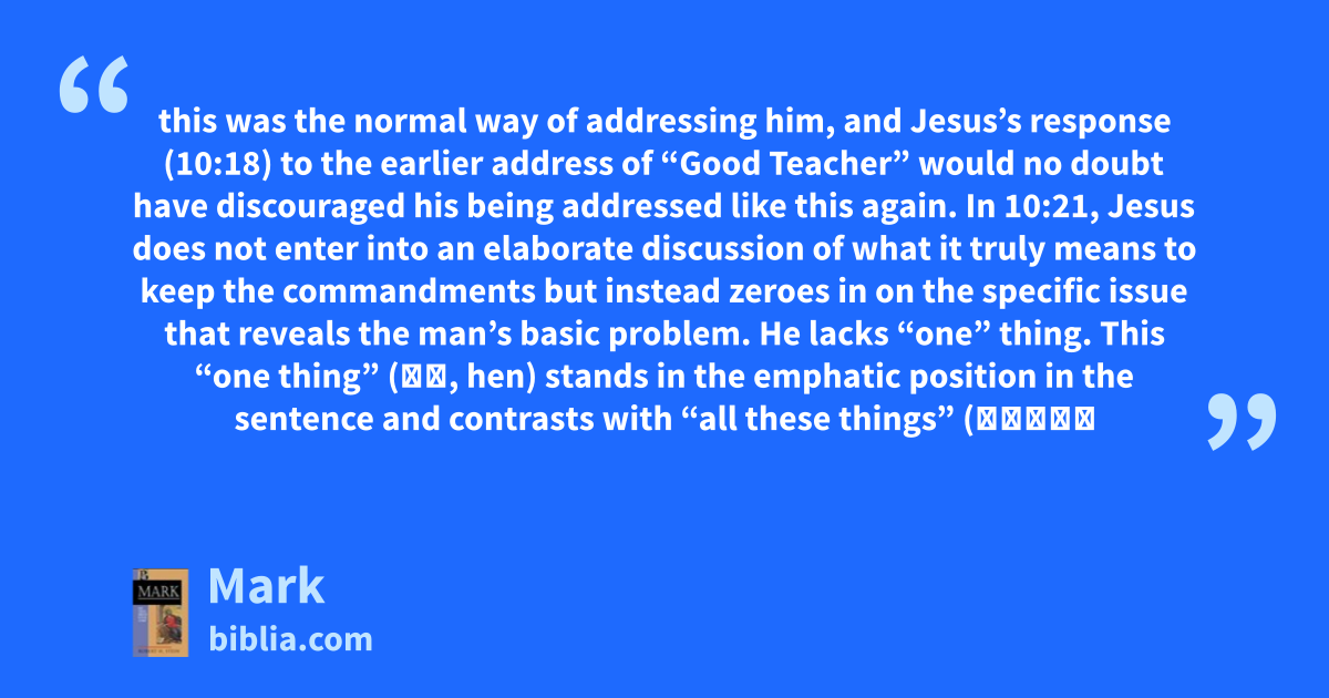 this was the normal way of addressing him, and Jesus’s response (10:18) to the earlier address of “Good Teacher” would no doubt have discouraged his being addressed like this again. In 10:21, Jesus does not enter into an elaborate discussion of what it truly means to keep the commandments but instead zeroes in on the specific issue that reveals the man’s basic problem. He lacks “one” thing. This “one thing” (ἕν, hen) stands in the emphatic position in the sentence and contrasts with “all these things” (ταῦτα