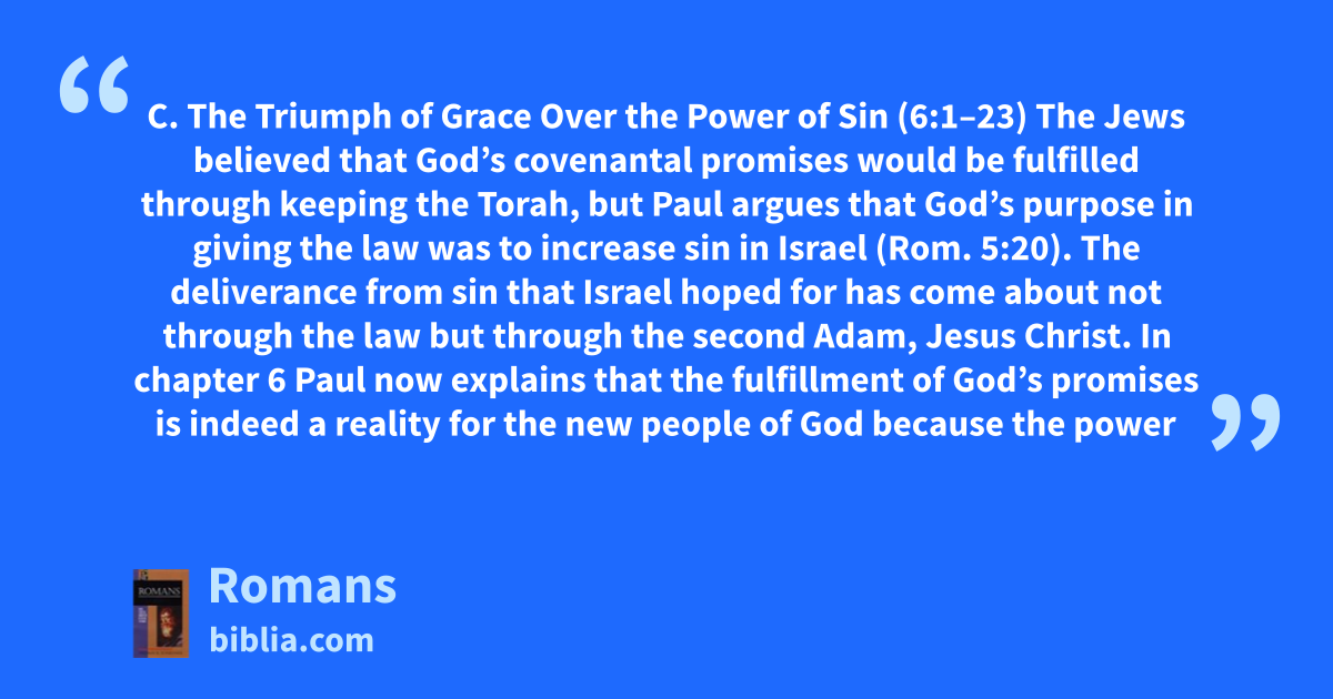 C. The Triumph of Grace Over the Power of Sin (6:1–23) The Jews believed that God’s covenantal promises would be fulfilled through keeping the Torah, but Paul argues that God’s purpose in giving the law was to increase sin in Israel (Rom. 5:20). The deliverance from sin that Israel hoped for has come about not through the law but through the second Adam, Jesus Christ. In chapter 6 Paul now explains that the fulfillment of God’s promises is indeed a reality for the new people of God because the power