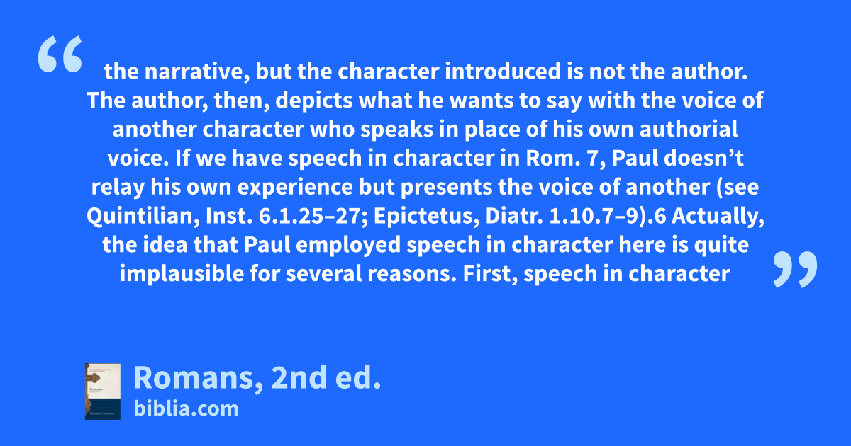 the narrative, but the character introduced is not the author. The author, then, depicts what he wants to say with the voice of another character who speaks in place of his own authorial voice. If we have speech in character in Rom. 7, Paul doesn’t relay his own experience but presents the voice of another (see Quintilian, Inst. 6.1.25–27; Epictetus, Diatr. 1.10.7–9).6 Actually, the idea that Paul employed speech in character here is quite implausible for several reasons. First, speech in character