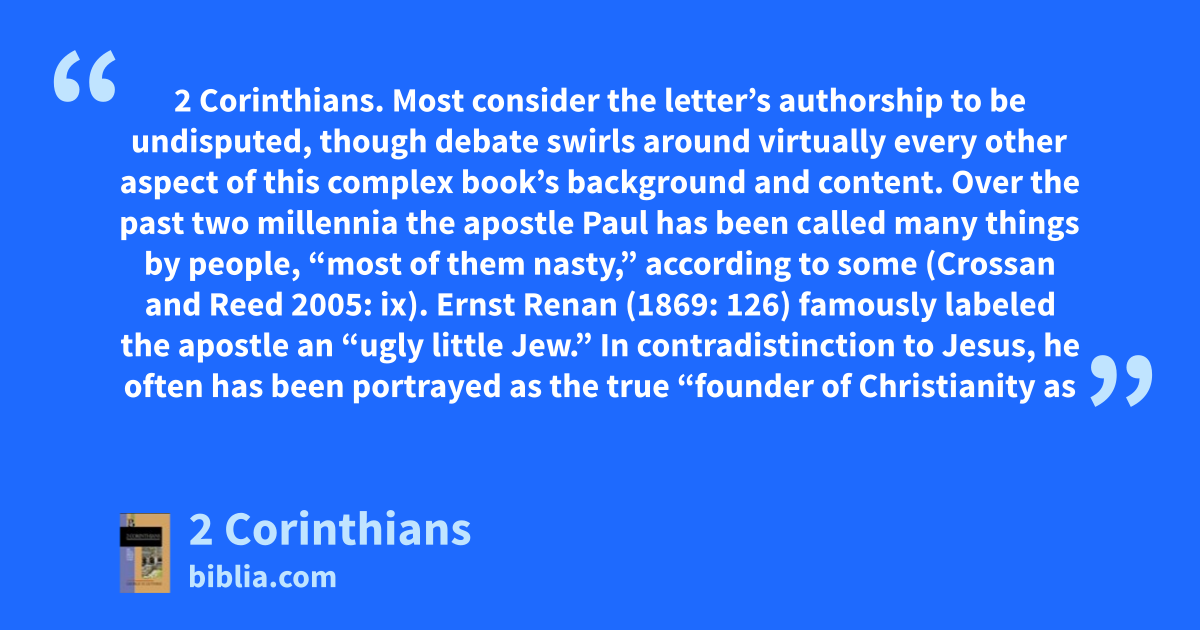 2 Corinthians. Most consider the letter’s authorship to be undisputed, though debate swirls around virtually every other aspect of this complex book’s background and content. Over the past two millennia the apostle Paul has been called many things by people, “most of them nasty,” according to some (Crossan and Reed 2005: ix). Ernst Renan (1869: 126) famously labeled the apostle an “ugly little Jew.” In contradistinction to Jesus, he often has been portrayed as the true “founder of Christianity as