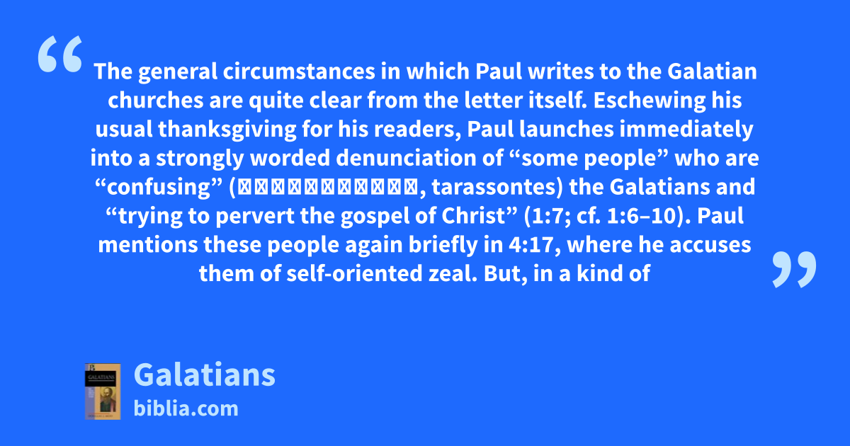 The general circumstances in which Paul writes to the Galatian churches are quite clear from the letter itself. Eschewing his usual thanksgiving for his readers, Paul launches immediately into a strongly worded denunciation of “some people” who are “confusing” (ταράσσοντες, tarassontes) the Galatians and “trying to pervert the gospel of Christ” (1:7; cf. 1:6–10). Paul mentions these people again briefly in 4:17, where he accuses them of self-oriented zeal. But, in a kind of