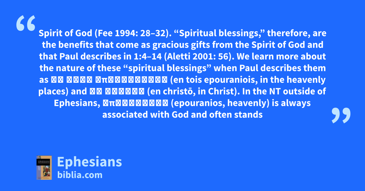Spirit of God (Fee 1994: 28–32). “Spiritual blessings,” therefore, are the benefits that come as gracious gifts from the Spirit of God and that Paul describes in 1:4–14 (Aletti 2001: 56). We learn more about the nature of these “spiritual blessings” when Paul describes them as ἐν τοῖς ἐπουρανίοις (en tois epouraniois, in the heavenly places) and ἐν Χριστῷ (en christō, in Christ). In the NT outside of Ephesians, ἐπουράνιος (epouranios, heavenly) is always associated with God and often stands