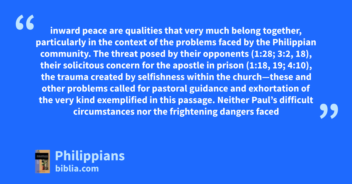 inward peace are qualities that very much belong together, particularly in the context of the problems faced by the Philippian community. The threat posed by their opponents (1:28; 3:2, 18), their solicitous concern for the apostle in prison (1:18, 19; 4:10), the trauma created by selfishness within the church—these and other problems called for pastoral guidance and exhortation of the very kind exemplified in this passage. Neither Paul’s difficult circumstances nor the frightening dangers faced