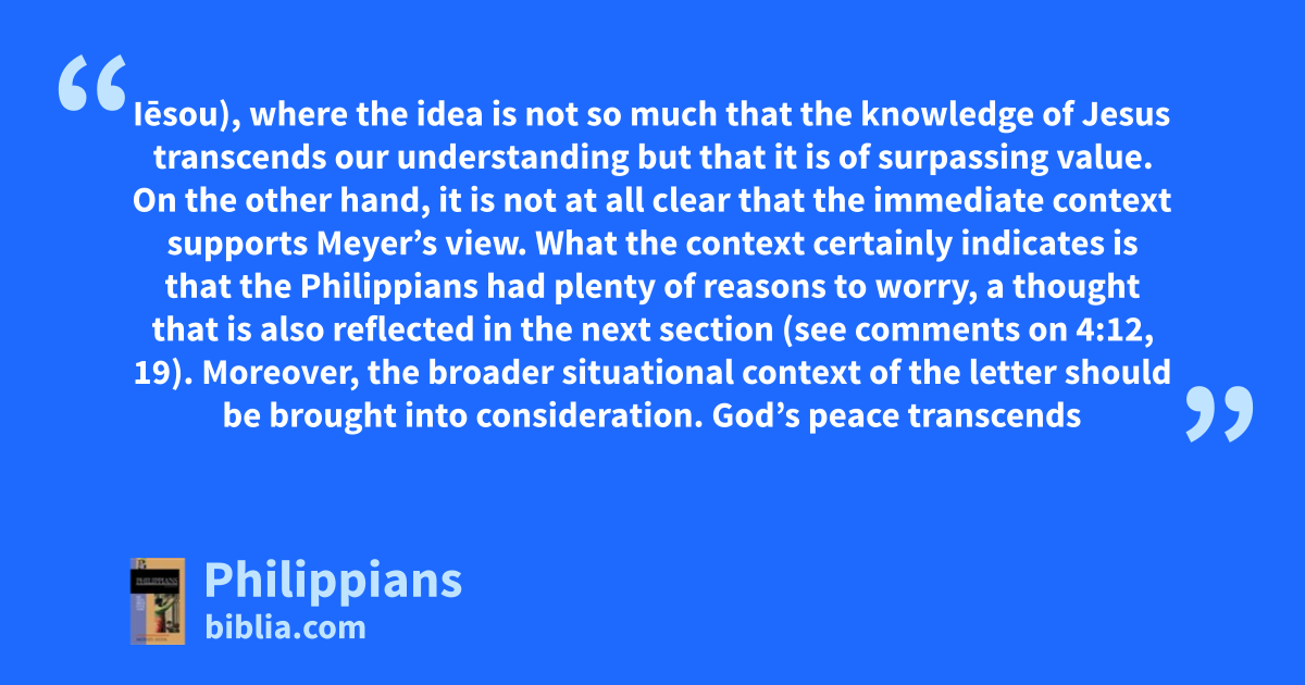 Iēsou), where the idea is not so much that the knowledge of Jesus transcends our understanding but that it is of surpassing value. On the other hand, it is not at all clear that the immediate context supports Meyer’s view. What the context certainly indicates is that the Philippians had plenty of reasons to worry, a thought that is also reflected in the next section (see comments on 4:12, 19). Moreover, the broader situational context of the letter should be brought into consideration. God’s peace transcends