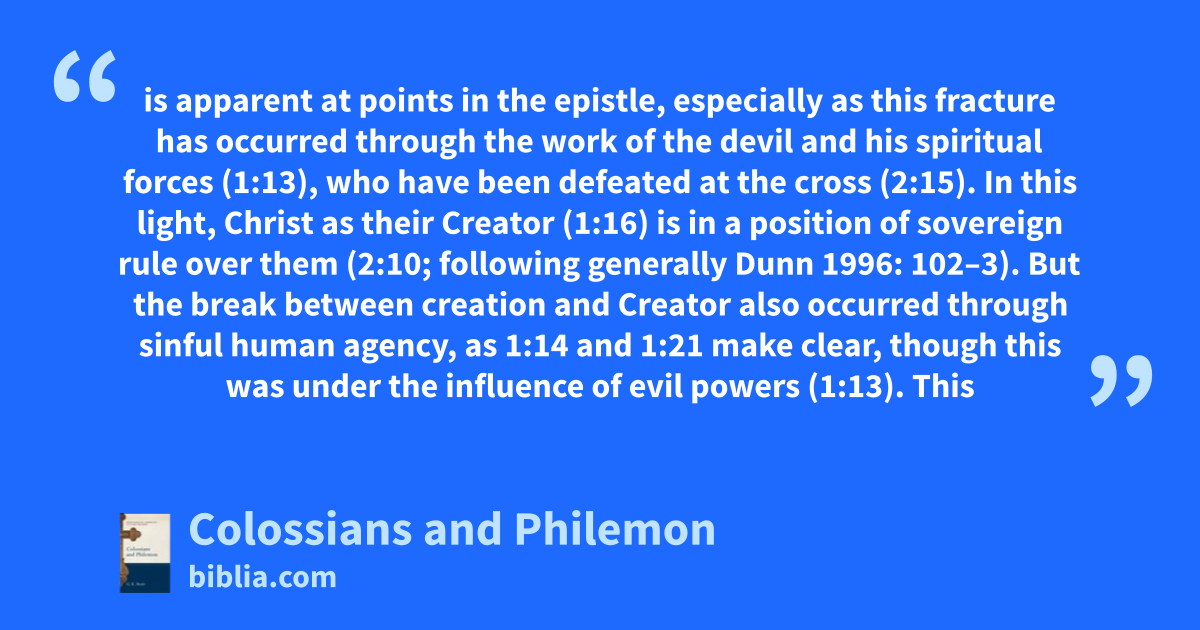 is apparent at points in the epistle, especially as this fracture has occurred through the work of the devil and his spiritual forces (1:13), who have been defeated at the cross (2:15). In this light, Christ as their Creator (1:16) is in a position of sovereign rule over them (2:10; following generally Dunn 1996: 102–3). But the break between creation and Creator also occurred through sinful human agency, as 1:14 and 1:21 make clear, though this was under the influence of evil powers (1:13). This