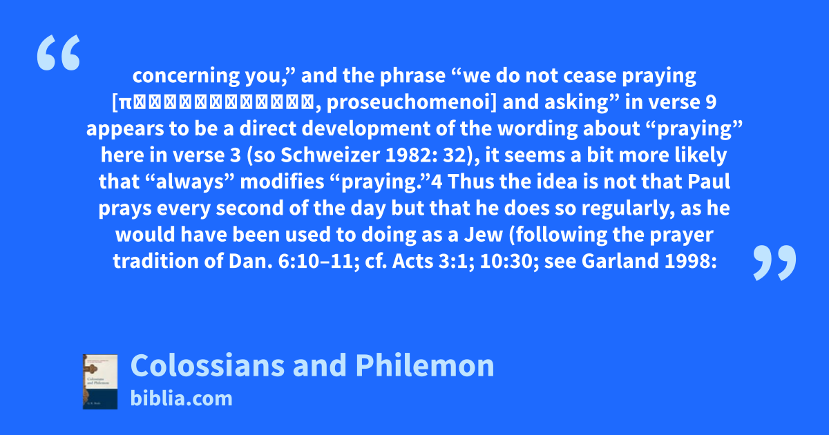 concerning you,” and the phrase “we do not cease praying [προσευχόμενοι, proseuchomenoi] and asking” in verse 9 appears to be a direct development of the wording about “praying” here in verse 3 (so Schweizer 1982: 32), it seems a bit more likely that “always” modifies “praying.”4 Thus the idea is not that Paul prays every second of the day but that he does so regularly, as he would have been used to doing as a Jew (following the prayer tradition of Dan. 6:10–11; cf. Acts 3:1; 10:30; see Garland 1998: