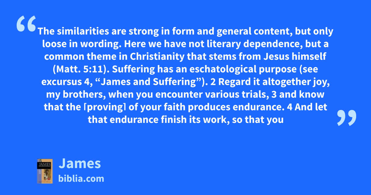 The similarities are strong in form and general content, but only loose in wording. Here we have not literary dependence, but a common theme in Christianity that stems from Jesus himself (Matt. 5:11). Suffering has an eschatological purpose (see excursus 4, “James and Suffering”). 2 Regard it altogether joy, my brothers, when you encounter various trials, 3 and know that the ⌜proving⌝ of your faith produces endurance. 4 And let that endurance finish its work, so that you