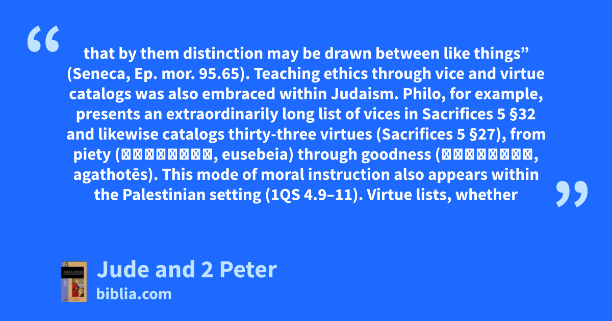 that by them distinction may be drawn between like things” (Seneca, Ep. mor. 95.65). Teaching ethics through vice and virtue catalogs was also embraced within Judaism. Philo, for example, presents an extraordinarily long list of vices in Sacrifices 5 §32 and likewise catalogs thirty-three virtues (Sacrifices 5 §27), from piety (εὐσέβεια, eusebeia) through goodness (ἀγαθότης, agathotēs). This mode of moral instruction also appears within the Palestinian setting (1QS 4.9–11). Virtue lists, whether