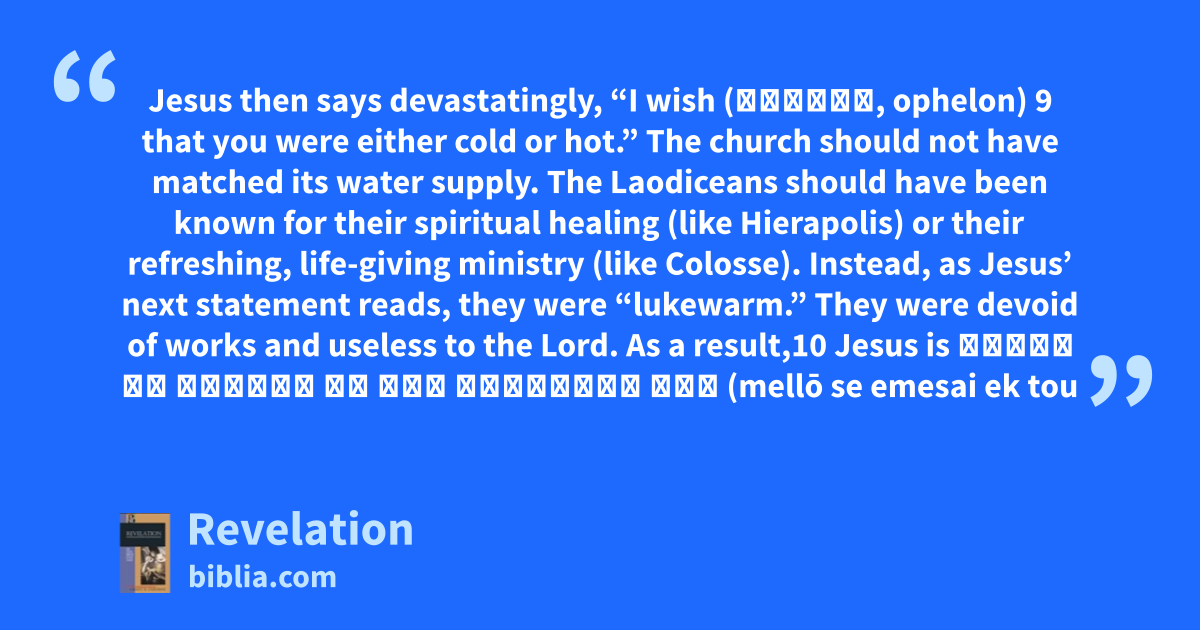 Jesus then says devastatingly, “I wish (ὄφελον, ophelon) 9 that you were either cold or hot.” The church should not have matched its water supply. The Laodiceans should have been known for their spiritual healing (like Hierapolis) or their refreshing, life-giving ministry (like Colosse). Instead, as Jesus’ next statement reads, they were “lukewarm.” They were devoid of works and useless to the Lord. As a result,10 Jesus is μέλλω σε ἐμέσαι ἐκ τοῦ στόματός μου (mellō se emesai ek tou