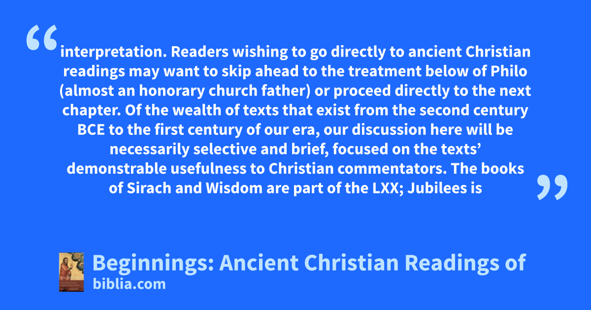 interpretation. Readers wishing to go directly to ancient Christian readings may want to skip ahead to the treatment below of Philo (almost an honorary church father) or proceed directly to the next chapter. Of the wealth of texts that exist from the second century BCE to the first century of our era, our discussion here will be necessarily selective and brief, focused on the texts’ demonstrable usefulness to Christian commentators. The books of Sirach and Wisdom are part of the LXX; Jubilees is