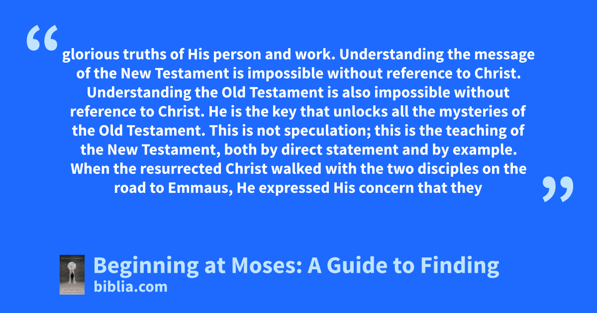 glorious truths of His person and work. Understanding the message of the New Testament is impossible without reference to Christ. Understanding the Old Testament is also impossible without reference to Christ. He is the key that unlocks all the mysteries of the Old Testament. This is not speculation; this is the teaching of the New Testament, both by direct statement and by example. When the resurrected Christ walked with the two disciples on the road to Emmaus, He expressed His concern that they