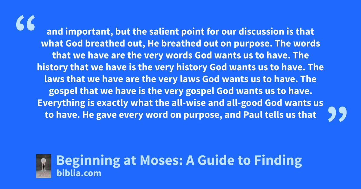 and important, but the salient point for our discussion is that what God breathed out, He breathed out on purpose. The words that we have are the very words God wants us to have. The history that we have is the very history God wants us to have. The laws that we have are the very laws God wants us to have. The gospel that we have is the very gospel God wants us to have. Everything is exactly what the all-wise and all-good God wants us to have. He gave every word on purpose, and Paul tells us that