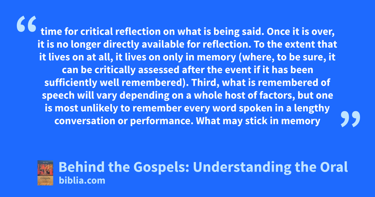time for critical reflection on what is being said. Once it is over, it is no longer directly available for reflection. To the extent that it lives on at all, it lives on only in memory (where, to be sure, it can be critically assessed after the event if it has been sufficiently well remembered). Third, what is remembered of speech will vary depending on a whole host of factors, but one is most unlikely to remember every word spoken in a lengthy conversation or performance. What may stick in memory