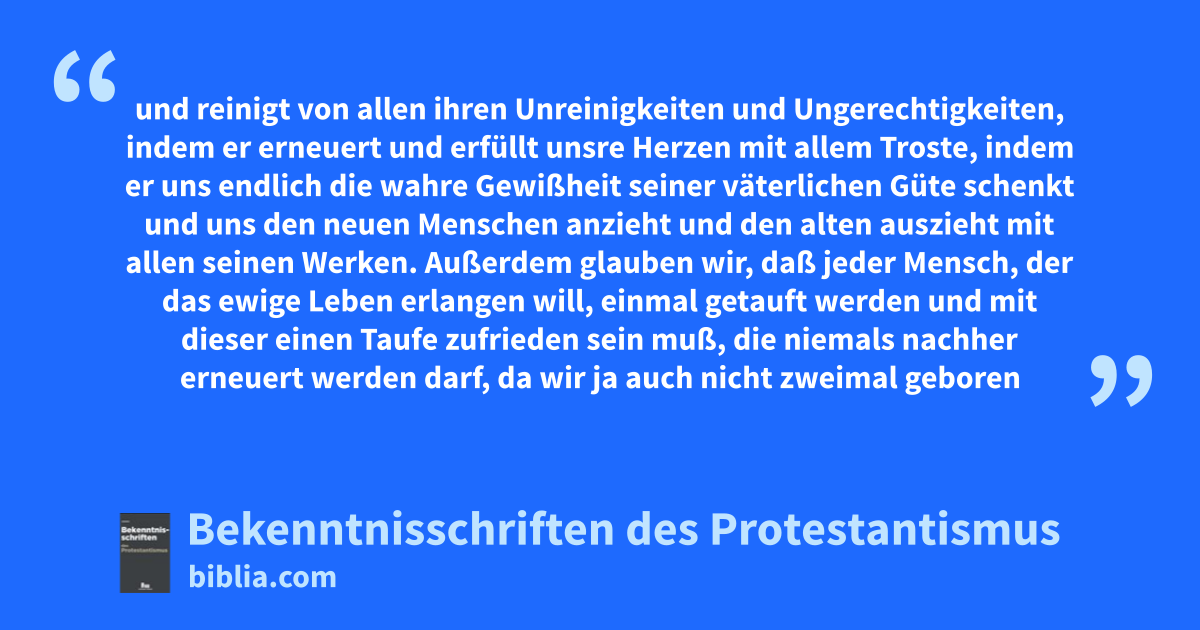 und reinigt von allen ihren Unreinigkeiten und Ungerechtigkeiten, indem er erneuert und erfüllt unsre Herzen mit allem Troste, indem er uns endlich die wahre Gewißheit seiner väterlichen Güte schenkt und uns den neuen Menschen anzieht und den alten auszieht mit allen seinen Werken. Außerdem glauben wir, daß jeder Mensch, der das ewige Leben erlangen will, einmal getauft werden und mit dieser einen Taufe zufrieden sein muß, die niemals nachher erneuert werden darf, da wir ja auch nicht zweimal geboren