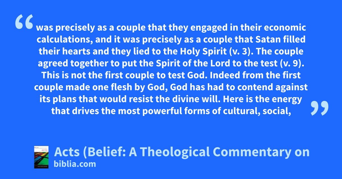 was precisely as a couple that they engaged in their economic calculations, and it was precisely as a couple that Satan filled their hearts and they lied to the Holy Spirit (v. 3). The couple agreed together to put the Spirit of the Lord to the test (v. 9). This is not the first couple to test God. Indeed from the first couple made one flesh by God, God has had to contend against its plans that would resist the divine will. Here is the energy that drives the most powerful forms of cultural, social,