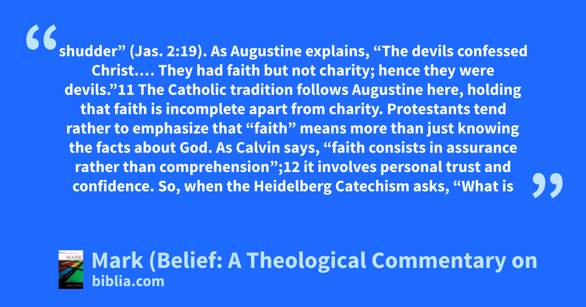 shudder” (Jas. 2:19). As Augustine explains, “The devils confessed Christ.… They had faith but not charity; hence they were devils.”11 The Catholic tradition follows Augustine here, holding that faith is incomplete apart from charity. Protestants tend rather to emphasize that “faith” means more than just knowing the facts about God. As Calvin says, “faith consists in assurance rather than comprehension”;12 it involves personal trust and confidence. So, when the Heidelberg Catechism asks, “What is