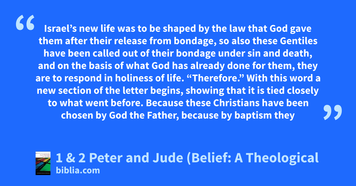 Israel’s new life was to be shaped by the law that God gave them after their release from bondage, so also these Gentiles have been called out of their bondage under sin and death, and on the basis of what God has already done for them, they are to respond in holiness of life. “Therefore.” With this word a new section of the letter begins, showing that it is tied closely to what went before. Because these Christians have been chosen by God the Father, because by baptism they