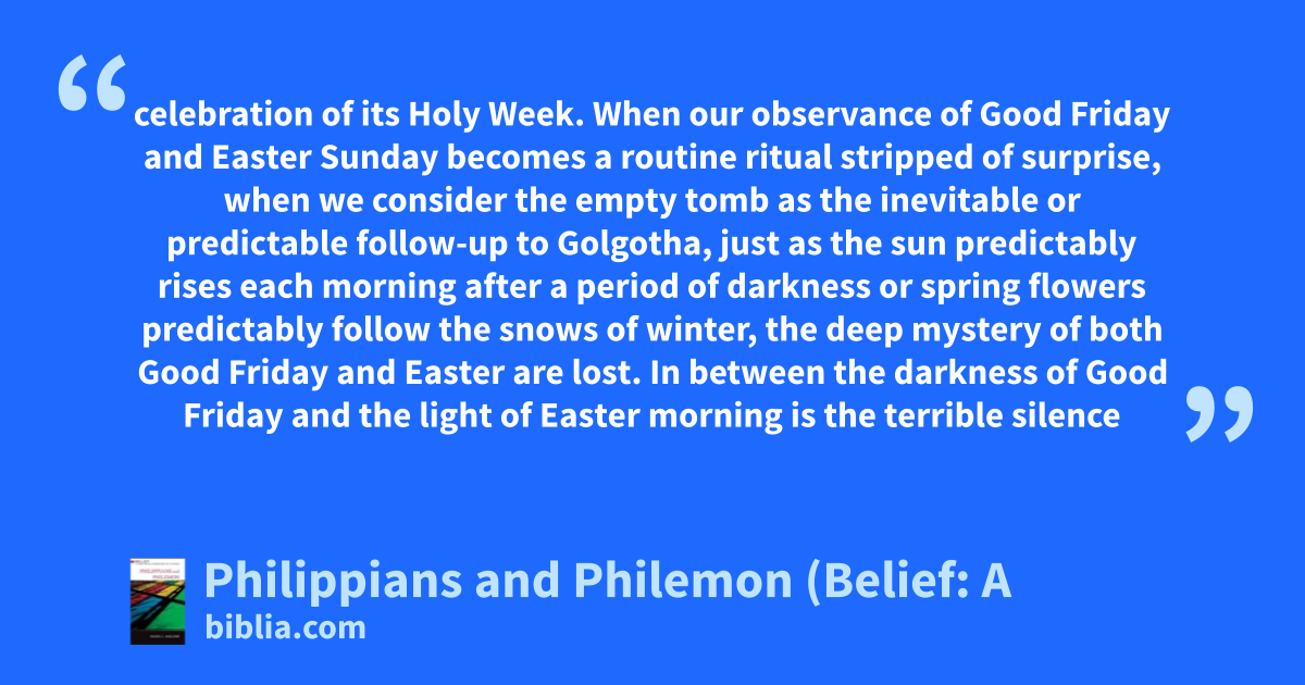 celebration of its Holy Week. When our observance of Good Friday and Easter Sunday becomes a routine ritual stripped of surprise, when we consider the empty tomb as the inevitable or predictable follow-up to Golgotha, just as the sun predictably rises each morning after a period of darkness or spring flowers predictably follow the snows of winter, the deep mystery of both Good Friday and Easter are lost. In between the darkness of Good Friday and the light of Easter morning is the terrible silence