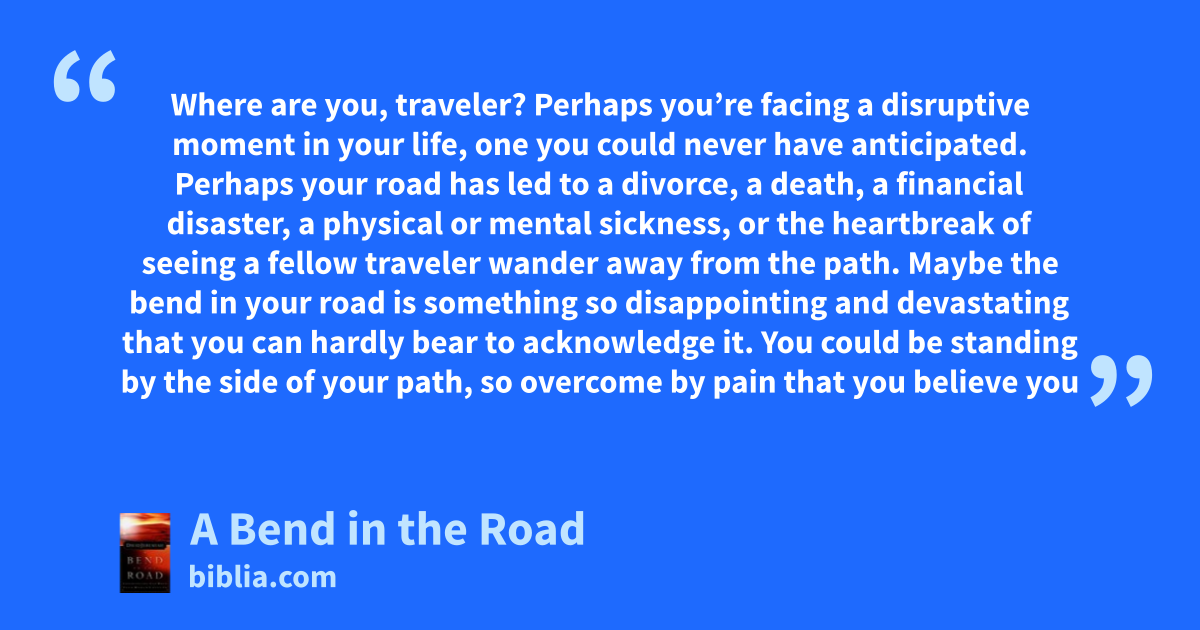 Where are you, traveler? Perhaps you’re facing a disruptive moment in your life, one you could never have anticipated. Perhaps your road has led to a divorce, a death, a financial disaster, a physical or mental sickness, or the heartbreak of seeing a fellow traveler wander away from the path. Maybe the bend in your road is something so disappointing and devastating that you can hardly bear to acknowledge it. You could be standing by the side of your path, so overcome by pain that you believe you