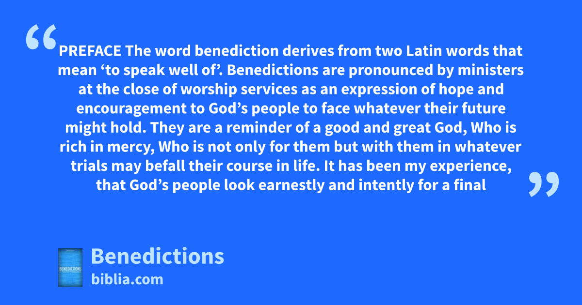 Benedictions, invocations to depart with God's blessings, are a feature of the church—every liturgical structure ends with them. They were a feature of the synagogue in Christ's time—indeed Christ himself uses them when he dismisses his disciples on a new task. The word benediction derives from two Latin words that mean "to speak well of." Benedictions are pronounced by ministers at the close of...