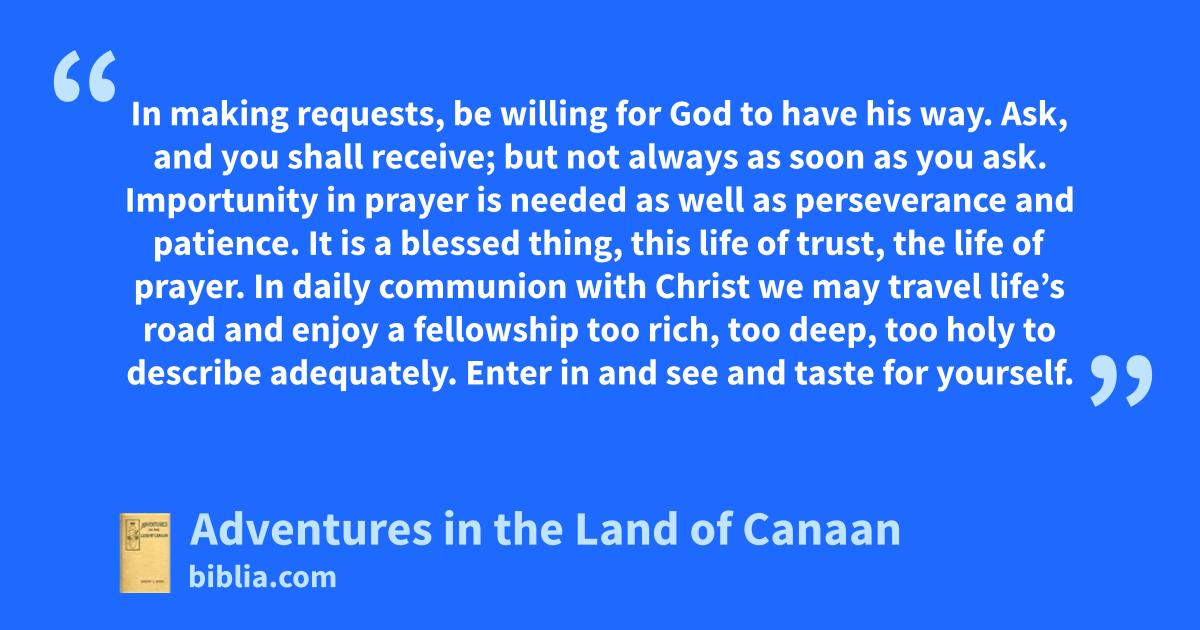In making requests, be willing for God to have his way. Ask, and you shall receive; but not always as soon as you ask. Importunity in prayer is needed as well as perseverance and patience. It is a blessed thing, this life of trust, the life of prayer. In daily communion with Christ we may travel life’s road and enjoy a fellowship too rich, too deep, too holy to describe adequately. Enter in and see and taste for yourself.